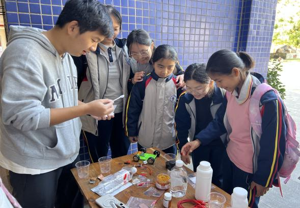 许书瑞老师团队则带来了自主研发的新能源动力小车,以 “看得见的化学能量转化” 引发同学们的强烈好奇。团队详细讲解了小车核心动力源—镁空气电池的绿色工作原理,清晰阐释阴极、阳极的化学反应机制,同时揭秘了基于 “碘钟反应” 的自动化控制系统,让同学们惊叹于化学与智能控制的奇妙联动。