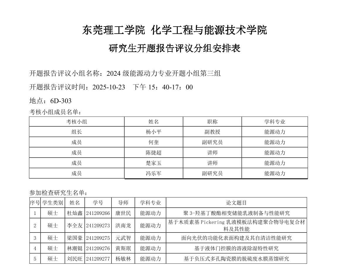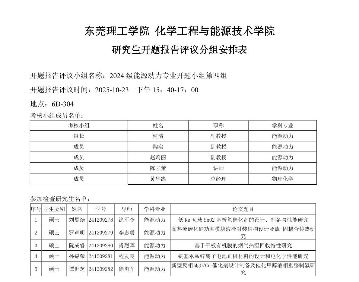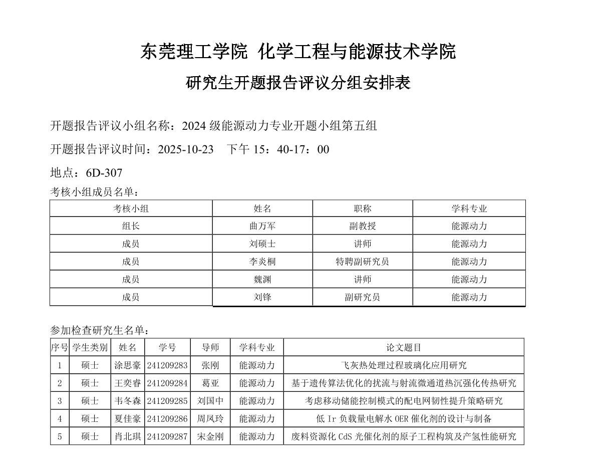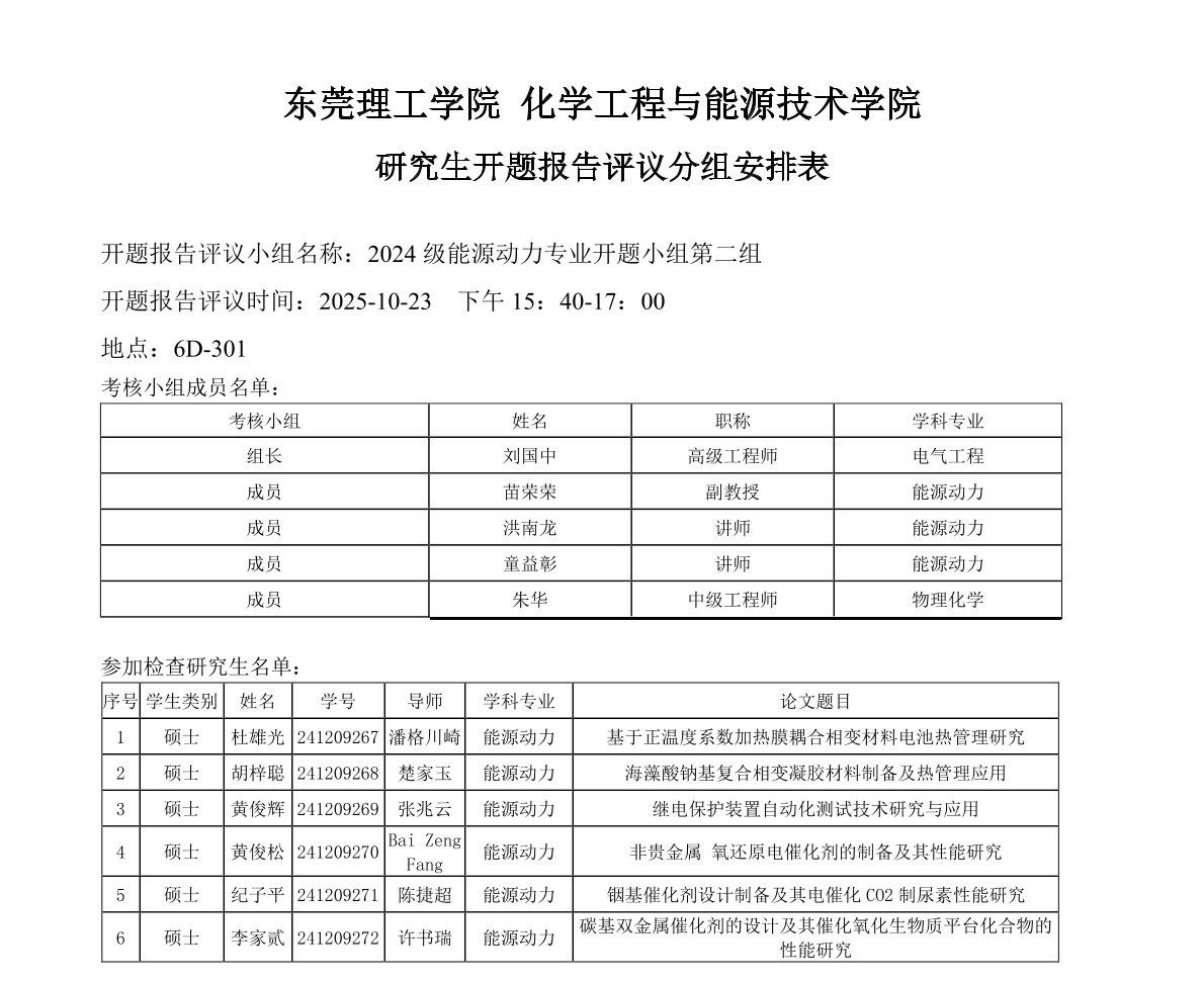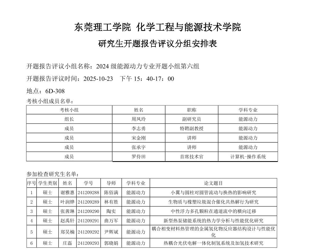 东莞理工学院能源动力学位点2024级研究生开题报告评议安排如下: