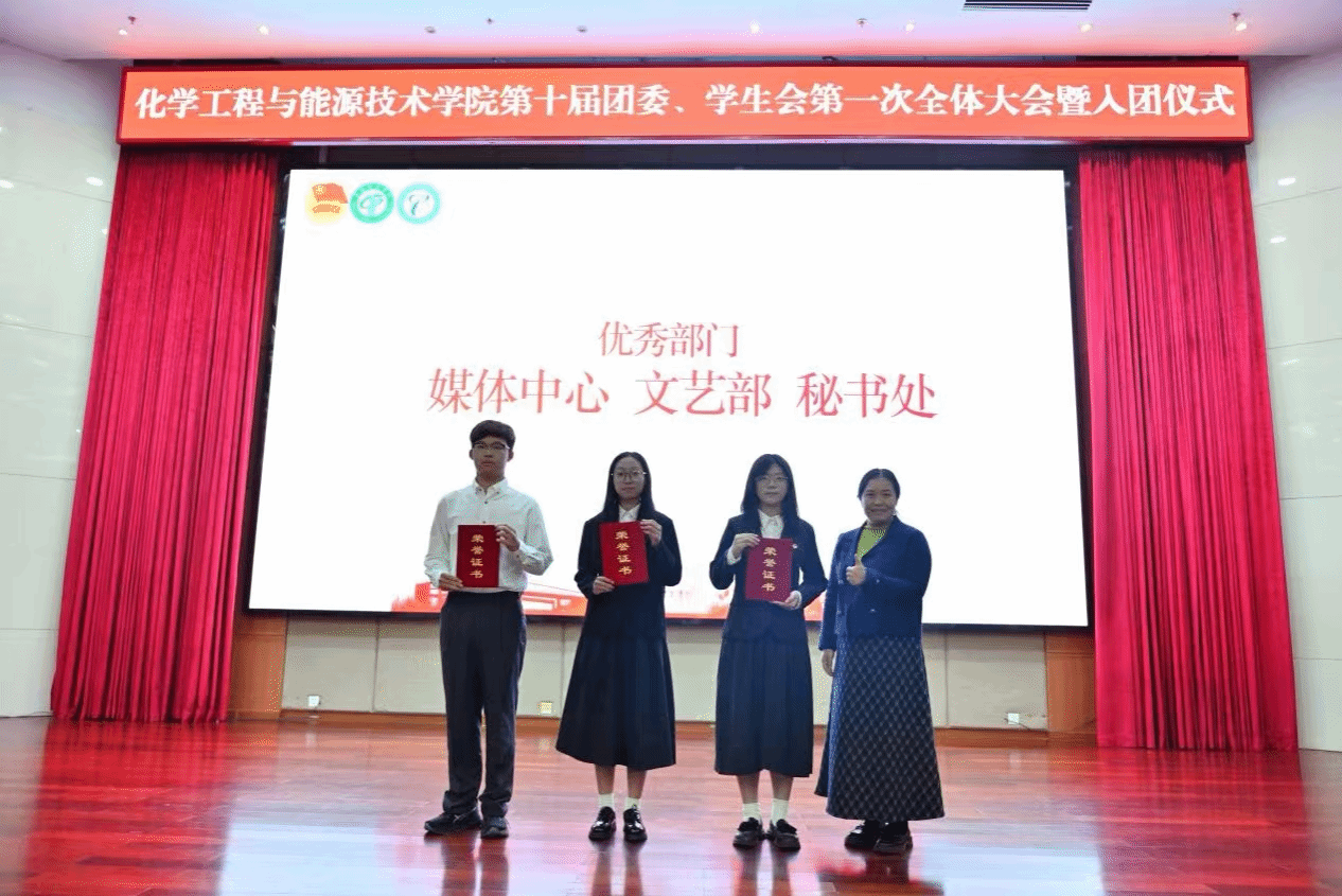 2025年12月4日,化能学院在学术会议中心报告厅召开第十届团委、学生会第一次全体大会暨2025年新团员入团仪式。化能学院党委副书记杨方、团委副书记黄千恩及政治辅导员涂叶满、刘哲、张博、王馨出席,第十届团委、学生会全体成员、2025年新团员参加。